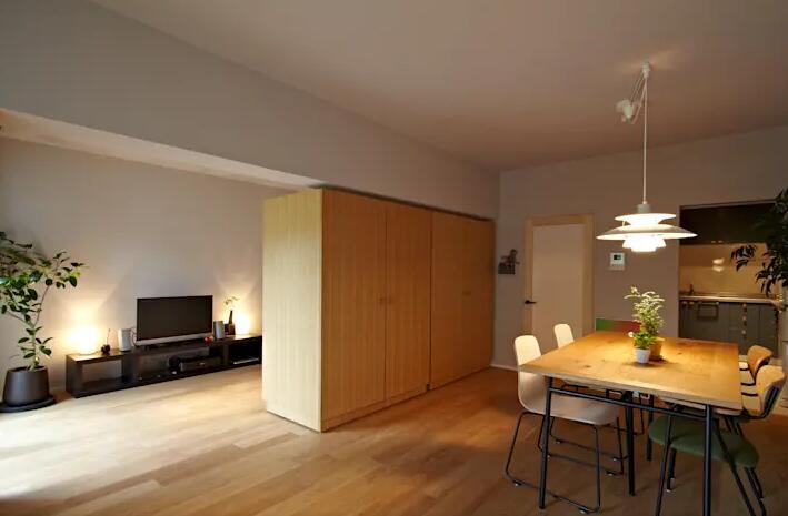 為了隔開大的空間,要么立固定式的墻壁,要么立可動式的。如果用固定式的墻壁隔開之后需要大的空間,非常遺憾。相反,雖然用可動式的家具把房間隔開,但我從未移動過它,也不必使其移動。在這張照片中,起居餐廳被可移動的儲物家具隔開,很多客人來訪時時可以將其旋轉(zhuǎn)移動90度,貼附在客廳的墻壁上,使房間顯得很大。最如果此隔板是固定墻的話,則墻的厚度約為10厘米左右,給人的印象就有所不同了,而且還要考慮是否有充足的空間。