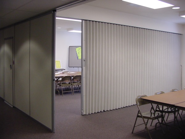配對(duì)成可操作的壁式折疊面板的照片示例,該面板設(shè)計(jì)成會(huì)議室的隔斷
