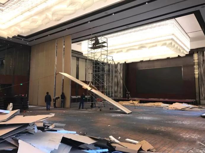 這種隔斷和酒店里裝的導(dǎo)軌式隔斷有什么區(qū)別呢?通常我們看到的酒店活動(dòng)隔斷為100型活動(dòng)隔斷,厚度為100mm,而超高型活動(dòng)隔斷最高可達(dá)12m。