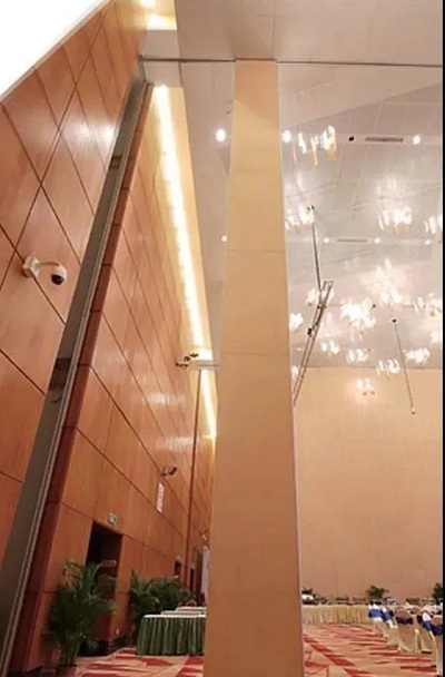 特高類型(標(biāo)高9m-18m)即可稱為超高型隔斷,是眾多高星級酒店常用的活動隔墻系統(tǒng),特高隔斷可以起到有效分割宴會廳,會議中心的空間,做到一廳多用,且互不干擾的用途。